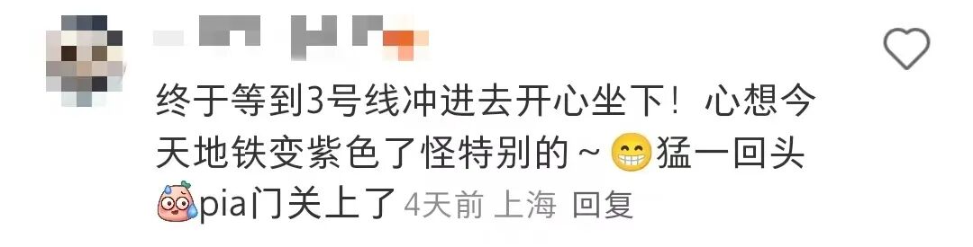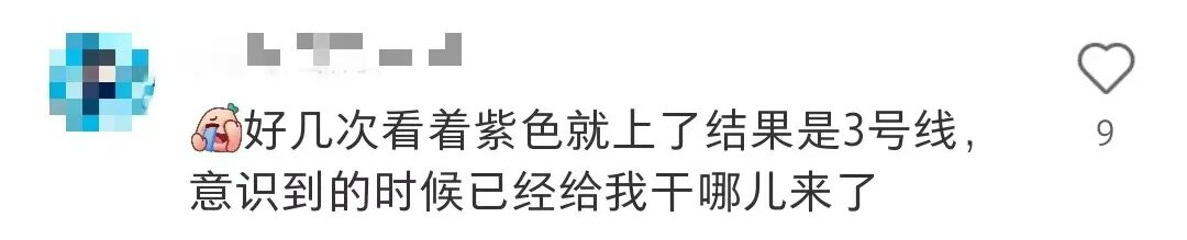 “我天天上班还坐错过好几次,紫色的3号线真的‘刺客’,里面连座位都是紫色,有时候甚至是3号线后面来的还是3号线,不带脑子上车一路坐到快终点站才发现。”