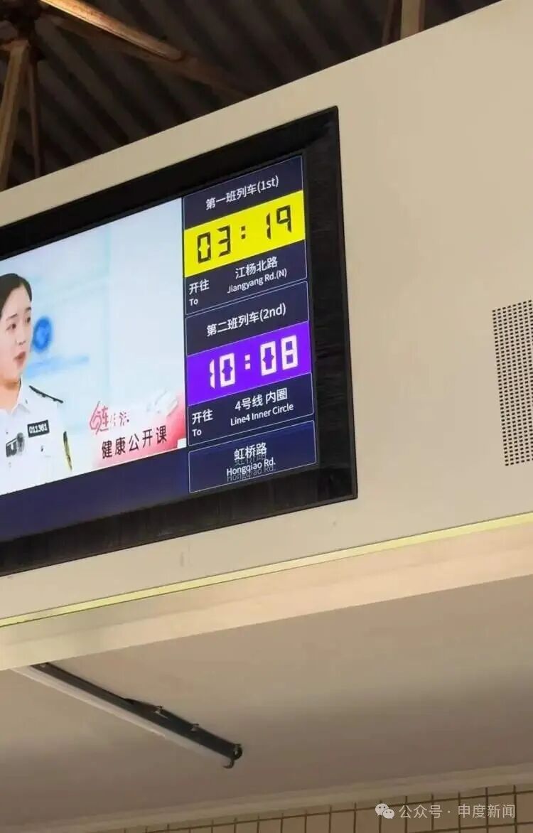 在虹桥路站台的显示屏上,记者注意到,下一班列车会显示还有几分钟到达,并且如果是3号线,则会加上黄色底色,如果是4号线,也会加上紫色的底色。