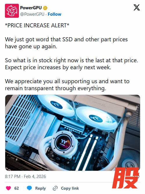 据外媒playground报道。PC装机市场又要变天了,知名硬件商PowerGPU刚刚发出了红色预警,SSD和“其他组件”的价格正在全面上涨。官方话说得很直白:“现在库存里的这点货,就是最后的平价粮,卖完这批,下周直接涨价。”